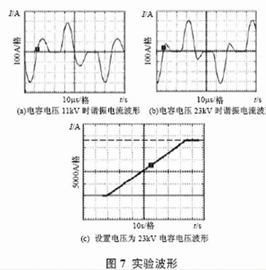根據上面所設計的諧振參數進行了實驗,實驗波形如圖7 所示。可以看出,為保持充電電流恒定,隨著輸出電壓的升高,開關頻率變高,實測充電電壓為23kV 時變換器效率為92.7%。實驗表明,所設計的諧振參數完全滿足設計要求,該裝置已用于神光III 能源系統。