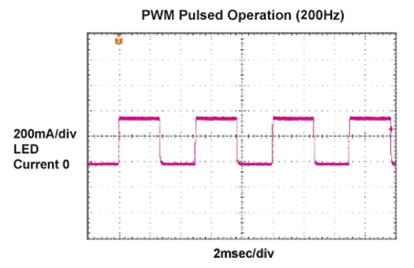 • 通過低頻PWM脈沖調制LED電流,控制LED燈源亮度