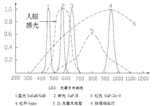 LED 的光譜分布與制備所用化合物半導(dǎo)體種類、性質(zhì)及pn結(jié)結(jié)構(gòu)(外延層厚度、摻雜雜質(zhì))等有關(guān),而與器件的幾何形狀、封裝方式無(wú)關(guān)。