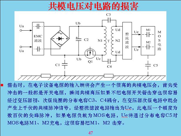 下面講一下共模電壓對(duì)電路的損害。其實(shí)共模電壓對(duì)開關(guān)電容前面的影響不是很大,最大是后面一點(diǎn),通過電壓器分布電路,以前的模式電路電壓用得很低,都是1v-5v左右,納米級(jí)容易擊穿,電容也相當(dāng)小。從里面串進(jìn)去的電壓經(jīng)過濾波不斷的吸收降下來,一般有上千伏,容易把后面的擊穿。在實(shí)踐過程中為了防雷,這幾個(gè)位置最好在上面布一個(gè)雷點(diǎn)電容,對(duì)防雷電擊穿很有效。共模電壓進(jìn)去以后瞬間擊穿,如果電子沒斷開,外面的電流會(huì)繼續(xù)延續(xù)下去把它燒掉,如果備一個(gè)電容上去,共模電容通過電容一下子把它吸收掉,讓幾個(gè)電容互相通電位,幾個(gè)模組不會(huì)那么容易擊穿。
