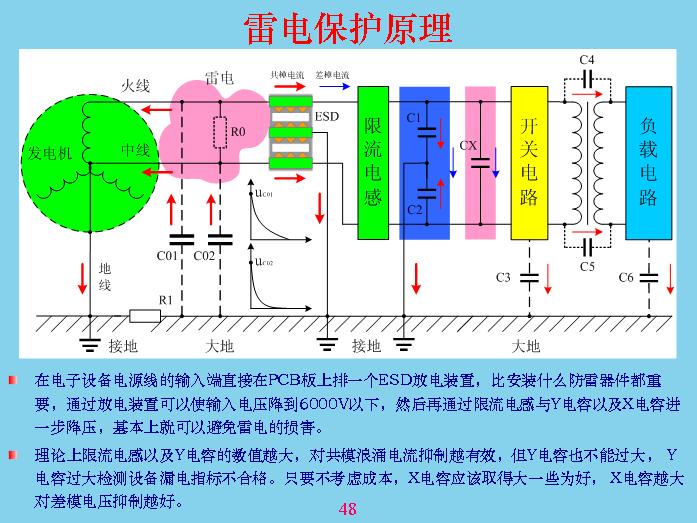 大家想想看,跟前面我們所說的,感應(yīng)雷這個(gè)東西沒有一個(gè)標(biāo)準(zhǔn)的概念說什么叫做感應(yīng)雷。只要打雷的話,外面打雷,窗戶上面的金屬,如果夜間都可以看到放電產(chǎn)生火花,這就是通過電磁感應(yīng)產(chǎn)生的位移電流原理。從原理上來說,三相四線或三相五線,發(fā)電機(jī)有中線接地,設(shè)備使用者的外殼接地是最有效的避雷方法,但現(xiàn)在很多設(shè)備都不接地,沒有辦法接,只有很貴重的進(jìn)口設(shè)備用三相電源,中間那一條地線,地線不是中線,大家要搞清楚。中線雖然是接地的,但在這里不能當(dāng)成地線,地線一定是自己大樓本身的地,而且要量好接地的地線。因?yàn)榈鼐€接進(jìn)去以后,大樓對(duì)外面的電磁層進(jìn)行屏蔽了,大樓相對(duì)來說也是導(dǎo)電的,就算不導(dǎo)電,現(xiàn)在國(guó)家都有安全要求,大樓超過多少層都要加上避雷針,就是防雷的。如果不能接地,你就要考慮充放電的問題。前面最好的共模電容我覺得還是要,我認(rèn)為這個(gè)共模電容最好連接上,不能接大地,要接在外殼上,接到外殼上有什么好處?共模電壓一進(jìn)來,雖然電流沒有通過地放電回路,把電壓舉高起來了,與外面輸入電壓是一樣的,外殼電壓取的一樣,起到了屏蔽作用。如果這個(gè)接地的話會(huì)更加安全,但是地線要足夠粗,回路也足夠,因?yàn)榉烹姷碾娏骱艽螅苋菀谉簟_@幾個(gè)東西是經(jīng)過很多年的試驗(yàn),8是很成熟的東西,不管做共模還是防雷都要做上,如果連機(jī)殼都沒有,只是塑料殼,也要考慮這根線接到什么位置最好?是接到里面面積最大的地方,就是公共地面積最大的地方,讓電位舉起來,其他電位差不會(huì)產(chǎn)生很大的電容回路。主要是考慮充放電回路,電流越小越好,兩個(gè)電位差越小越好。
