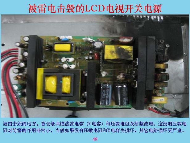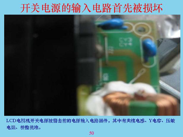 下面我們講一些具體的。這是一個(gè)開關(guān)電源,開關(guān)電源被雷劈的時(shí)候,輸入回路基本上都燒了,假如沒燒是什么樣的?可以看看,這是橋堆,這兩個(gè)是Y電容,這里面還有一個(gè)壓敏電阻。這是共模線圈,雷劈以后全部燒了,說明壓敏電阻沒有起到什么保護(hù)作用,兩個(gè)電容都燒了,說明電感相當(dāng)、相當(dāng)?shù)馗摺榱朔乐估纂姡紫惹懊嬉欢ㄒ右粋€(gè)能量吸收,比較大的東西,成本相對(duì)來說比較低,像試驗(yàn)站里面的放電裝置,那個(gè)東西沒有地方裝,也貴得很。在硬紙板上面排幾個(gè)鋸齒,中間隔一個(gè)頭就行了。如果中間隔6mm也可以。有一個(gè)一級(jí)電感,電感可以使瞬間上去很快的電壓降下來,突然加一個(gè)1萬伏、10萬伏,加上去只有這兩端,另外兩端建立不起來,所以剛加進(jìn)去的時(shí)候?qū)纂妬碚f,大部分能量都被吸收掉了。后面經(jīng)過這個(gè)以后,剩余部分通過共膜電容繼續(xù)吸收,吸收完以后還有差模部分,產(chǎn)生的差模部分通過電容把差模吸收掉。共模電容和差模電容具有抑制傳導(dǎo)干擾的作用,對(duì)雷電也有抑制作用,所以很多人也在問,電容接到前面好還是接在后面好?這個(gè)東西看你有什么作用,如果只是為了防EMI電磁干擾的話,接在越前面越好,接在測(cè)試儀表的輸入端最好,接到那里把信號(hào)全部短路掉了,就看不到了。但是對(duì)于雷電,你接到后面要好很多,所以這主要是防雷的,你就不要考慮電磁干擾和EMC了,盡量把兩個(gè)放在后面。