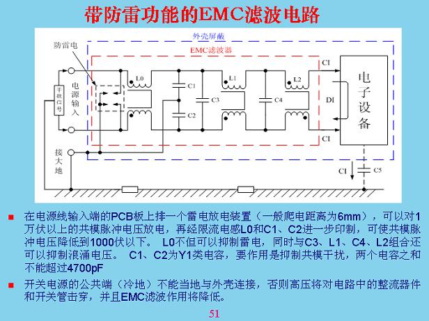 按照道理EMI是電磁干擾,避雷元器件按照道理并不聯(lián)系在一起,但EMC濾波里面,與EMC濾波器同樣有防雷功能,就是前面的幾個(gè)電感和共模電容還有差模電容對(duì)防雷都起到作用,大家要理解,EMC濾波是用于設(shè)備上的,但反過來考慮雷電的時(shí)候,你就要把干擾信號(hào)從外面輸進(jìn)來,要這樣考慮了,不能單方面,最好在防雷加上一個(gè)放電裝置加在電感后面,共用共模濾波電容。