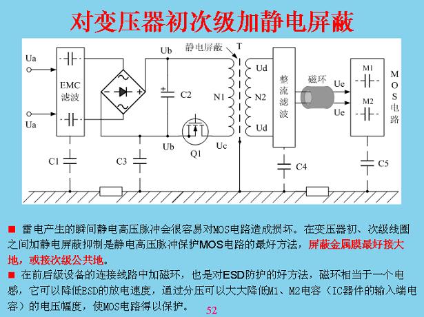 對(duì)于一些比較貴重的儀器、設(shè)備,在開關(guān)電容電壓器這里最好做靜電比例,在初次級(jí)線圈中間做一個(gè)鋁箔片都可以,包一層,這層不能短路,短路的話變壓器就會(huì)燒掉,包在外面可以短路,包在里面不能短路,包在外面吸收漏電電感,包在里面的主回路里面會(huì)短路,然后把它進(jìn)行接地,這相當(dāng)于可以隔離掉。這個(gè)有一個(gè)教訓(xùn),前段時(shí)間康佳臺(tái)灣裝LCD屏測(cè)試,打了一個(gè)隔離變壓器,后面就是接測(cè)試儀表,每個(gè)月都有一臺(tái)、兩臺(tái)測(cè)試儀表損壞,查不出原因,最后讓他們把隔離變壓器的中間屏蔽才好。屏蔽以后,進(jìn)一步有機(jī)會(huì)的話,在接頭有連接的地方加一個(gè)磁環(huán),讓共模電壓將磁環(huán)速度放慢,緩沖一下,讓瞬間能量降低,瞬間能量緩慢一點(diǎn),慢慢的過,損傷就會(huì)少很多。所有電路都可以把它看成一個(gè)分布電流,只要某地方電壓電位在改變,對(duì)后面都會(huì)產(chǎn)生充放電,從這上面理解就知道了,如果哪個(gè)地方構(gòu)成回路,如果有一個(gè)高電壓進(jìn)來一直傳導(dǎo)到后面,最后充電,充電可以理解成分布電容,如果沒有這個(gè)也有一個(gè)分布電容在里面,把分布電容放在這里,就比較形象地。就像以前的絕緣長(zhǎng)效濾管一樣,手一摸沒有造成回路也壞掉了,絕緣的濾管很容易壞,一從里面拿出來,手一摸就壞掉,一個(gè)身上面帶正電,或者你作為天線有感應(yīng)電壓,感應(yīng)一下來回充放電就壞掉了。
