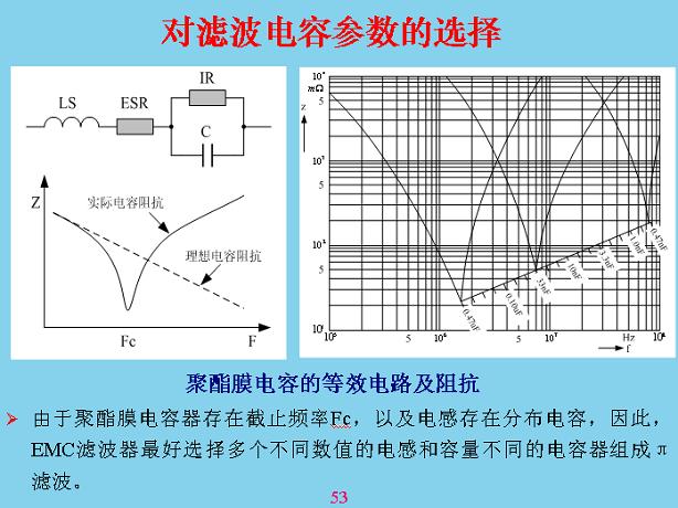 對(duì)于濾波電容,大家注意前面的EMC濾波,這個(gè)電容不是理想電容,里面有一個(gè)電感,還有漏電電阻,里面有串聯(lián)電阻,電感和電容有沒有產(chǎn)生串聯(lián)諧振?曲線是這樣一條斜線,串聯(lián)諧振相當(dāng)于把信號(hào)短路掉了,信號(hào)短路的阻礙很大,這里面有一個(gè)最佳值,然后成為感線,進(jìn)行EMC電路設(shè)計(jì)的時(shí)候最好用不同的電容進(jìn)行配模,這是0.4的曲線,33nF并聯(lián)就可以保證在上面不是好的,單獨(dú)一個(gè)電容后面覆蓋不到,以后有機(jī)會(huì)我講這些元器件,你們?cè)诖髮W(xué)里面學(xué)的是符號(hào),對(duì)電阻電容基本是不懂的,還有電組電容這方面的問題最多,還有電容,電容來回極化的時(shí)候,速度跟不上外面的變化,會(huì)損耗相當(dāng)大,會(huì)燒壞,特別是脈壓電容,很多人認(rèn)為體積越小越好,但沒有考慮在開關(guān)上容易出現(xiàn)問題。