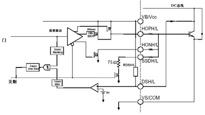 圖4顯示了帶IGBT保護的一個HVIC三相門驅(qū)動的輸出。在ON狀態(tài)時,通過一個外部二極管感測IGBT收集器-發(fā)射器電壓,可以探測到過流的發(fā)生。然后將Vce與一個8V的臨界電壓進(jìn)行比較,作為結(jié)果的信號會被過濾1μs。這里還采用一個3μs消隱濾波器(blankingfilter),目的是移除IGBT開啟時的末端電流。當(dāng)探測到高端降飽和條件時,輸出級立刻就進(jìn)入高阻抗?fàn)顟B(tài),SSD被激活,通過SSD的H/L針腳上的75Ω的內(nèi)部阻抗就可關(guān)斷IGBT。SSD驅(qū)動保持該狀態(tài)7μs,使得IGBT可以平穩(wěn)地放電,也可加一個外部電阻來進(jìn)一步控制放電速率。