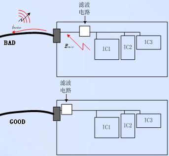 對(duì)于時(shí)鐘線、總線、射頻線等強(qiáng)輻射信號(hào)線和復(fù)位信號(hào)線、片選信號(hào)線、系統(tǒng)控制信號(hào)等敏感信號(hào)線,應(yīng)遠(yuǎn)離接口外出信號(hào)線。從而避免強(qiáng)輻射信號(hào)線上的干擾耦合到外出信號(hào)線上,向外輻射;也避免接口外出信號(hào)線帶進(jìn)來的外來干擾耦合到敏感信號(hào)線上,導(dǎo)致系統(tǒng)誤操作。