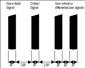 布線分離的作用是將PCB同一層內(nèi)相鄰線路之間的串?dāng)_和噪聲耦合最小化。3W規(guī)范表明所有的信號(hào)(時(shí)鐘,視頻,音頻,復(fù)位等等)都必須象圖10所示那樣,在線與線,邊沿到邊沿間予以隔離。為了進(jìn)一步的減小磁耦合,將基準(zhǔn)地布放在關(guān)鍵信號(hào)附近以隔離其他信號(hào)線上產(chǎn)生的耦合噪聲。