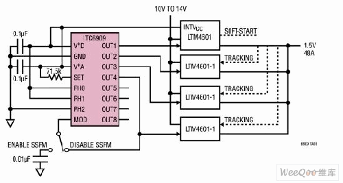硅振蕩器為多相、擴頻開關穩壓器時鐘提供了一個理想的平臺。除了具有一個板上時鐘發生器之外,這些固態器件還能將擴頻調制與多相輸出組合起來。考慮到這一點,凌力爾特公司開發出了LTC6909(圖1),這是一款具有8個單獨多相輸出的精準擴頻硅振蕩器。單個電阻器負責在12.5kHz至 6.67MHz的范圍內選擇輸出頻率。三個邏輯輸入用于設定輸出相位關系(范圍從45°至120°),從而允許LTC6909為多達8個相位提供同步。可以啟用一種偽隨機擴頻調頻,頻率擴展量在中心頻率的±10%。用戶可選擇3種調制速率之一,以確保調制速率不超過穩壓器的帶寬。此外,LTC6909還具有一個創新的濾波器,該濾波器負責跟蹤SSFM調制速率并在頻率轉換之間提供平滑處理。
