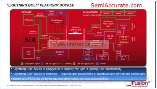 從硬件層面上看,Lightning Bolt其實很簡單,驅動級的硬件兼容性使得芯片上的USB通道及APU上的DP通道用一條線纜就可以連接起來并輸出到hub上。