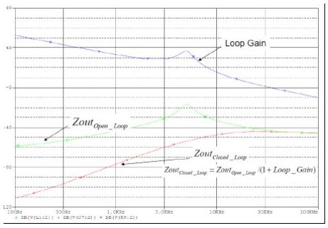 由于該圖形以對(duì)數(shù)表示,即簡(jiǎn)單的減法,因此在增益較高的低頻率區(qū)域阻抗會(huì)大大降低;在增益較少的高頻率區(qū)域閉環(huán)和開(kāi)環(huán)阻抗基本上是一樣的。在 此需要說(shuō)明如下要點(diǎn):1)峰值環(huán)路阻抗出現(xiàn)在電源交叉頻率附近,或出現(xiàn)在環(huán)路增益等于 1(或 0dB)的地方;以及 2)在大部分時(shí)間里,電源控制帶寬都將會(huì) 高于濾波器諧振,因此峰值閉環(huán)阻抗將取決于交叉頻率時(shí)的輸出電容阻抗。