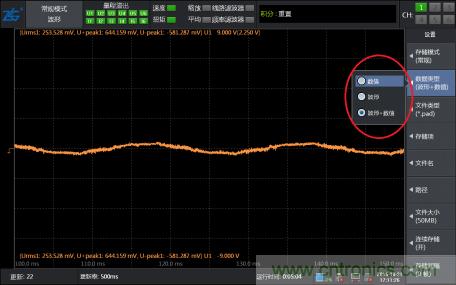 第四步,找到了想要觀察的波形幀之后,可以通過“FORM按鍵調(diào)整界面的窗口時間,對波形進行任意放大或縮小”并可以調(diào)出光標(biāo)測量任意兩點的橫縱軸數(shù)據(jù)。看到這里我相信大部分人已經(jīng)可以找到自己想要看的波形了。但是想要把波形存儲記錄下來怎么辦,而且想要長時間記錄可以實現(xiàn)嗎?不要急,PA功率分析儀還提供波形保存記錄功能。