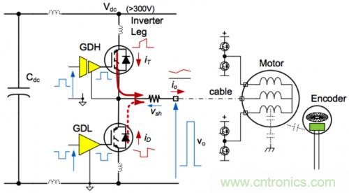 三相逆變器是一種功率電子開關電路,控制功率從直流供電軌到三個交流電機繞組的流動。逆變器有三條相同的腿,每條腿包括兩個IGBT晶體管和兩個二極管,如圖1所示。每個電機繞組均連接至通過分流器連接高端晶體管和低端晶體管的同一節(jié)點。逆變器使電機繞組在直流總線的高壓軌和低壓軌之間切換,以控制平均電壓。繞組具有極高的電感性,將阻擋電流的變化,因此,當功率晶體管關閉時,電流將開始在連接至相反電源軌的二極管中流動。這樣,即使逆變器功率設備和直流鏈路電容中存在斷續(xù)傳導,也會有電流連續(xù)流到電機繞組中。電機繞組阻抗充當來自逆變器的高壓脈沖寬度調制方波輸出電壓的低通濾波器。將低壓控制電流連接至逆變器時存在巨大的困難。一個基本問題是,高端晶體管發(fā)射器節(jié)點在高壓總線高供電軌與低供電軌之間切換。首先,高端驅動器必須能夠驅動相對于一個發(fā)射器(可能比共用輸入信號高300 V或以上)的柵極信號。其次,通過分流器(vsh)的電機電流信號必須從300 V或以上的共模電壓中提取出來。其他問題將由電源電路中的寄生元件導致。當功率晶體管或二極管的開關頻率超過1 A/ns時,即使是10 nH的PCB走線電感也可能導致顯著的電壓(>10 V)。寄生電感和部件電感會導致振鈴,結果使設備開關產(chǎn)生的噪聲脈沖的持續(xù)時間變長。甚至電機電纜的高頻阻抗也可能帶來問題,因為出于安全考慮,配電板可能離電機很遠。其他效應包括噪聲從電機耦合到反饋傳感器信號中,其原因是快速切換的繞組電壓波形。問題將變得更加嚴重,因為驅動電路的功率額定值將增加電路板的物理尺寸,結果將進一步增加寄生電感,甚至提高電流和電壓開關速率。