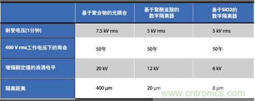 安全標準通常規(guī)定1分鐘耐壓額定值(典型值2.5 kV rms至5 kV rms)和工作電壓(典型值125 V rms至400 V rms)。某些標準也會規(guī)定更短的持續(xù)時間、電壓浪涌(如10 kV峰值并持續(xù)50 µs)作為增強絕緣認證的一部分要求。聚合物/聚酰亞胺隔離器可提供最好的隔離特性(見表1)。聚酰亞胺數(shù)字隔離器與光耦合器類似,在典型工作電壓下,工作壽命超過電機,額定使用壽命為50年。SiO2隔離器的工作壽命與之接近,但是,對高能浪涌的保護能力卻較弱。