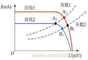 最大功率點A1→最大功率點B1(條件:將系統負載特性由負載1改為負載2)