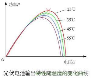 在一定的光照強度和環境溫度下,光伏電池可以工作在不同的輸出電壓,但是只有在某一輸出電壓值時,光伏電池的輸出功率才能達到最大值,這時光伏電池的工作點就達到了輸出功率電壓曲線的最高點,稱之為最大功率點。如圖2所示為MPPT受光照影響圖、圖 3所示為MPPT受溫度影響圖
