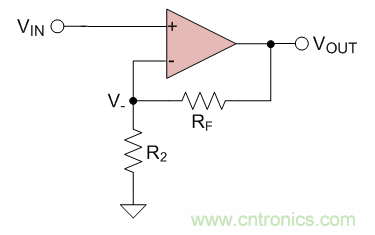 等式中A_CL是閉環增益,R_F 是反饋電阻值,而R_2 是從負輸入端到信號(反相)或接地(非反相)的電阻值。