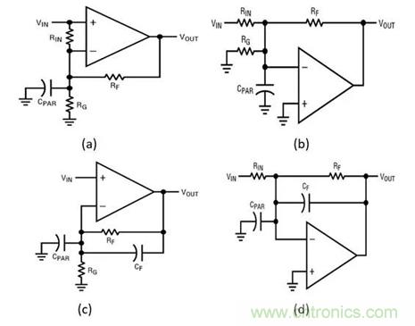 這里依次列舉一些有關(guān)電流反饋放大器 (CFA) 的評論。如果圖 5a 中的放大器是一個 CFA,則“Rin”對于更改頻率響應(yīng)所起的作用甚微,因為負(fù)輸入是非常低的阻抗并主動地拷貝正輸入。噪聲指標(biāo)將略有劣化,而且額外的負(fù)輸入偏置電流實際上將以 Vos/Rin 的形式出現(xiàn)。同樣,就頻率響應(yīng)而言,圖 5b 中的電路未被“Rg”所改變。反相輸入并不僅僅是一個虛擬地,它是一個真正的接地低阻抗,而且已經(jīng)容許了 Cpar (僅限負(fù)輸出模式!)。DC 誤差類似于圖 5a 中所示的情形。圖 5c 和 5d 對于電壓輸入運放可能是優(yōu)選方案,但是 CFA 完全不能容許一個沒有振蕩的直接反饋電容器。