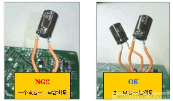 B. 方法(2):在電源板的錫面找出待測電容正負(fù)極對應(yīng)的焊點(diǎn),焊上兩根導(dǎo)線,然后用電壓探頭夾住引出的導(dǎo)線測試.如下圖:
