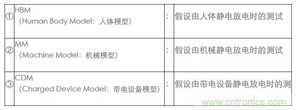 ESD耐性測試方法根據產生靜電的模型,分為以下三種:①HBM、②MM、③CDM。