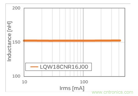 由于電感器的電流值發(fā)生變化,電感值也會發(fā)生變化。如圖2所示,LQW18CN系列對于AC電流的電感值依存性非常小。因此,即使NFC電路流通的AC電流變大,特性也不會發(fā)生很大變化。此外,如圖3 所示,即使是大電流也能保持低ACR。