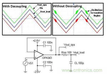 圖 1 為帶去耦電容器和不帶去耦電容器(C1 和C2)情況下用于驅(qū)動 R-C 負載的緩沖電路。我們注意到,在不使用去耦電容器的情況下,電路的輸出信號包含高頻 (3.8MHz) 振蕩。對于沒有去耦電容器的放大器而言,通常會出現(xiàn)穩(wěn)定性低、瞬態(tài)響應(yīng)差、啟動出現(xiàn)故障以及其它多種異常問題。