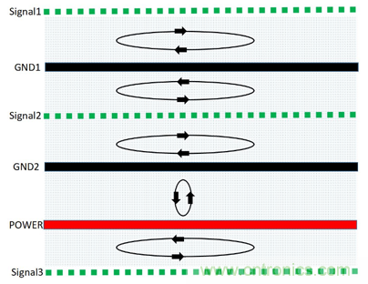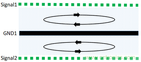 根據(jù)麥克斯韋方程,分立的帶電體或電流,它們之間的一切電的及磁的作用都是通過它們之間的中間區(qū)域傳遞的,不論中間區(qū)域是真空還是實體物質(zhì)。在PCB中磁通總是在傳輸線中傳播的,如果射頻回流路徑平行靠近其相應的信號路徑,則回流路徑上的磁通與信號路徑上的磁通是方向相反的,這時它們相互疊加,則得到了通量對消的效果。
