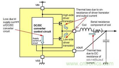 使用DC/DC轉(zhuǎn)換器所期待的最大目的之一是高效率地轉(zhuǎn)換能量。提高效率的方法在于降低損耗。如圖3所示,作為發(fā)生損耗的問(wèn)題,可以列舉IC的消耗電流、驅(qū)動(dòng)器晶體管導(dǎo)通電阻產(chǎn)生的熱損耗,線(xiàn)圈的串聯(lián)連接而產(chǎn)生的損耗等重大原因。