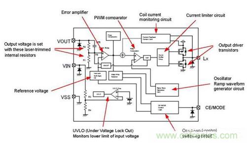 內部電路由基準電壓、誤差放大器、振蕩器、指示燈波形、PWM比較器、UVLO、限定電流電路等構成,固定輸出電壓型由激光微調固定調整了內部電阻R1/R2的電阻比。工作電壓范圍在1.8V~6V之間。此外,內部調整了放大器的相位補償及送信頻率、軟啟動時間等,可以完全無須調整地使用。