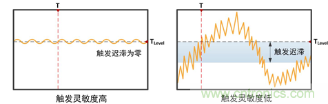 觸發電平只是一根參考電壓,而實際的波形在邊沿處是存在抖動的,如圖8所示,圖中波形的干擾非常小,但是上升沿還是存在鋸齒狀,當噪聲很大時抖動會更劇烈。如果想穩定觸發波形的上升沿,則需要在觸發電平的上下范圍內使用遲滯比較,以過濾觸發電平附近的波形抖動和毛刺。這個遲滯范圍就是觸發靈敏度。