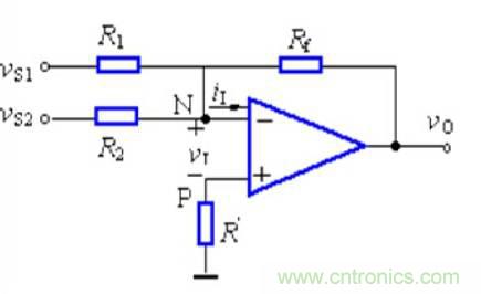 如下圖1-2,是運(yùn)放實(shí)現(xiàn)的加法器,用虛短和虛斷的方法來分析此電路。