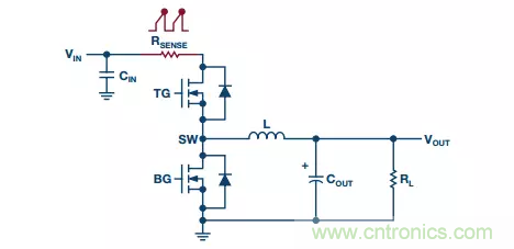 對于降壓調節器,電流檢測電阻有多個位置可以放置。當放置在頂部MOSFET的高端時(如圖3所示),它會在頂部MOSFET 導通時檢測峰值電感電流,從而可用于峰值電流模式控制電源。但是,當頂部MOSFET關斷且底部MOSFET導通時,它不測量電感電流。