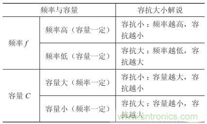 表1-2給出了容抗、頻率、容量三者之間關(guān)系的小結(jié)。