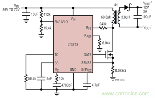 圖 1:采用主端輸出電壓檢測的 LT3748 反激式轉(zhuǎn)換器。