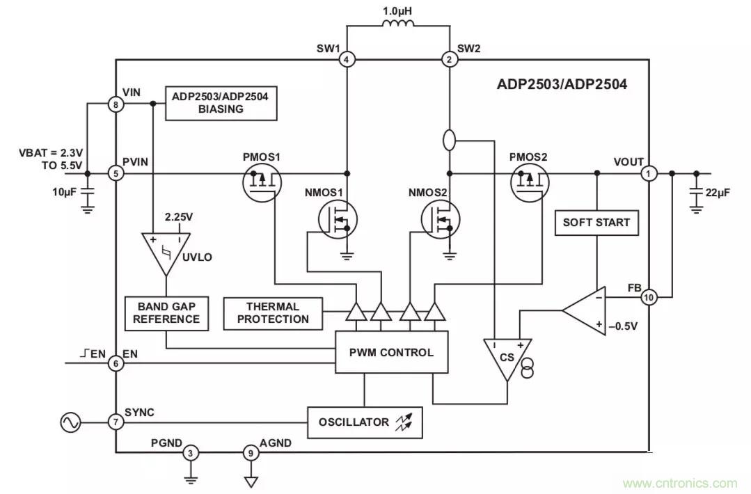 這樣的器件譬如ADI公司的ADP2503和ADP2504降壓-升壓轉換器,它們內置四個開關、兩個電容和一個電感。