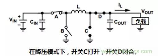 在降壓模式下, 降壓-升壓轉換器工作如下圖,Vin大于Vout時,開關C打開,開關D閉合。