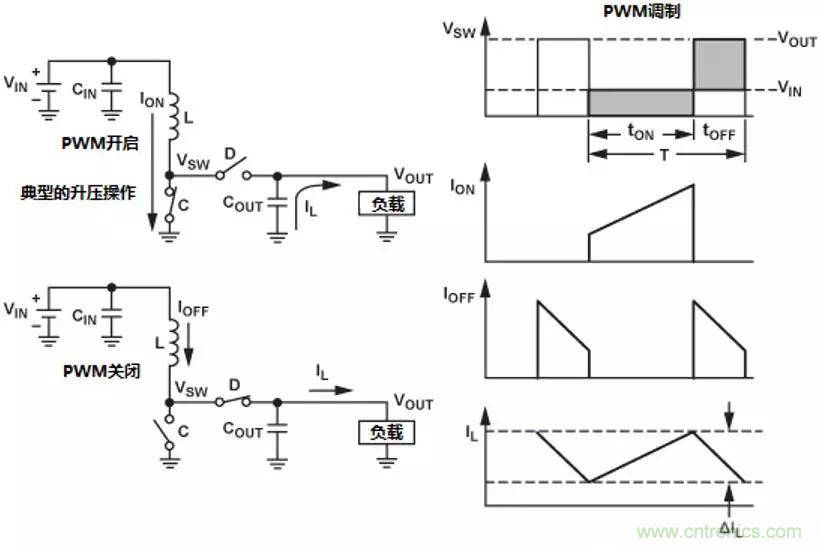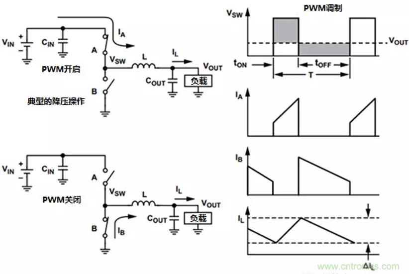 占空比 = 開關開通的時間/ 工作同周期。開通和關閉開關影響了電感能量的儲存和釋放,從而影響輸出的電壓。
