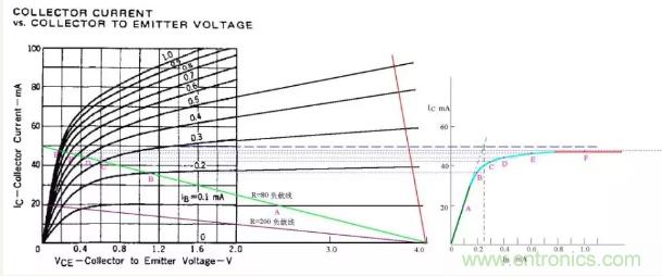圖中假定電源電壓為4V,綠色的斜線是負載電阻為80歐姆的負載線,V/R=50MA,圖中標出了Ib分別等于0.1、0.2、0.3、0.4、0.6、1.0mA的工作點A、B、C、D、E、F。據此在右側作出了Ic與Ib的關系曲線。根據這個曲線,就比較清楚地看出“飽和”的含義了。曲線的綠色段是線性放大區(qū),Ic隨Ib的增大幾乎成線性地快速上升,可以看出β值約為200。蘭色段開始變彎曲,斜率逐漸變小。紅色段就幾乎變成水平了,這就是“飽和”。實際上,飽和是一個漸變的過程,蘭色段也可以認為是初始進入飽和的區(qū)段。在實際工作中,常用Ib*β=V/R作為判斷臨界飽和的條件。在圖中就是假想綠色段繼續(xù)向上延伸,與Ic=50MA的水平線相交,交點對應的Ib值就是臨界飽和的Ib值。圖中可見該值約為0.25mA。