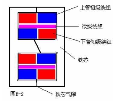 最后說一說繞組線圈的結(jié)構(gòu),因為膽機(jī)的后級都是用對管組成推挽電路的,為了防止由于兩管負(fù)載不平衡所引鐵芯起直流磁化,上下管的負(fù)載繞組不僅要做到電感一致,并且直流電阻也要一致,另外為了較少線間分布電容,在繞法上采取分層分邊的繞法,如圖B-2是音頻輸出變壓器繞組的結(jié)構(gòu)剖面圖。這種繞組結(jié)構(gòu)可使上下輸出管的總電抗保持一致,從減少線間的分布電容的角度來看,層分得越多越細(xì)越好,從而使輸出信號的頻響特性得到較好的改善。
