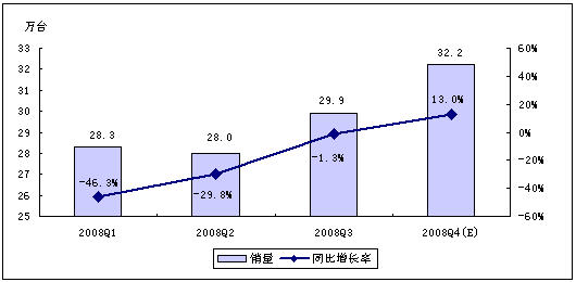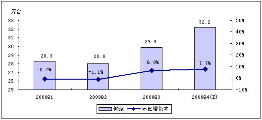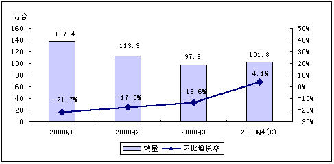 賽迪顧問預(yù)測,受全球經(jīng)濟(jì)危機(jī)以及中國經(jīng)濟(jì)發(fā)展趨緩等因素影響,2008年第四季度,MP3/PMP播放機(jī)行業(yè)將不會呈現(xiàn)快速增長的勢頭,但年終禮品市場的啟動,在一定程度上仍然會拉動整體市場向前發(fā)展。賽迪顧問預(yù)計,2008年第四季度,中國MP3/PMP播放機(jī)市場銷量為134.0萬臺,銷售額將達(dá)7.9億元。