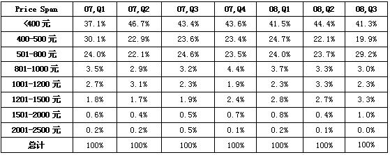 2007年Q1-2008年Q3中國MP3市場不同價格段銷量結(jié)構(gòu)