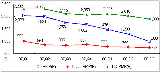 2007年Q1-2008年Q3中國PMP播放機(jī)市場不同存儲介質(zhì)產(chǎn)品價格走勢