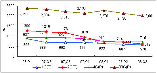 2007年Q1-2008年Q3中國PMP播放機(jī)市場主要容量產(chǎn)品價格走勢