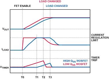 這個公式假定負載電流瞬時從0 A上升到30 A,這是一個理想情況。實際上,較大MOSFET的柵極電荷量QGS會限制柵極電壓的壓擺率,從而限制上電電流,因此,一定量的電荷會傳輸到負載電容而不觸發定時器功能。在圖4中,具有較大QGS的MOSFET會導致定時器的工作時間短于具有較小QGS的MOSFET,前者為T1 ~ T3,而后者為T0 ~ T2。[page]