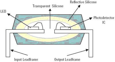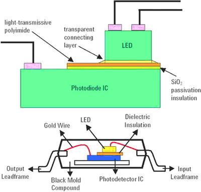 光電二極管芯片采用兩個透明的層:SiO2鈍化/絕緣和光傳導聚酰亞胺。LED使用透明的連接層穩固地連接到光電二極管上。IC使用銀環氧樹脂,通過模具連接到引線框上。介電材料使用光傳導環氧樹脂連接到IC上。LED模具使用光傳導環氧樹脂連接到介電材料上。最后,組件使用焊接線和澆鑄。它使用標準模具連接工藝,完成所有放置,封裝在單次不透明澆鑄化合物中完成澆鑄。