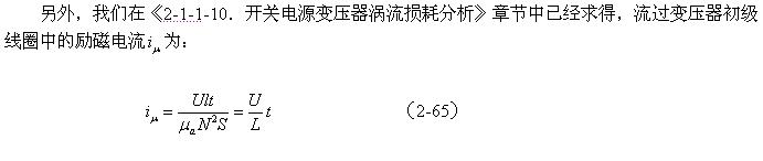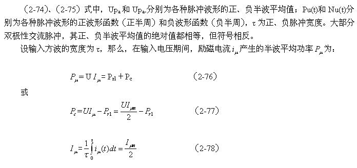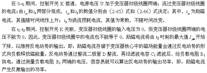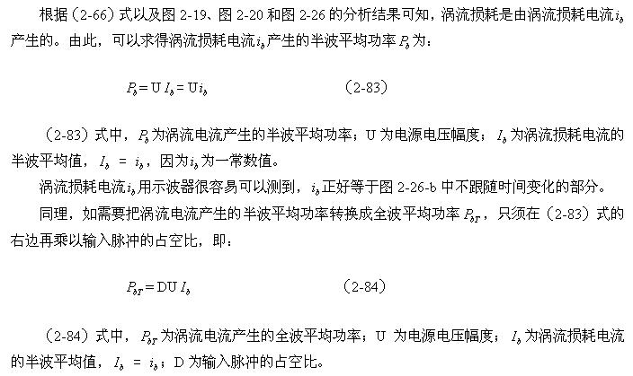 順便指出:(2-84)式的結(jié)果,是認為渦流損耗在t1-t2期間(圖2-26-b)完全等于0而求得的,但實際上,在t1-t2期間變壓器初級線圈產(chǎn)生的反電動勢同樣也會在變壓器鐵芯中感應(yīng)產(chǎn)生渦流損耗電流,即當輸入電壓為0時刻,在變壓器鐵芯中還存在很短暫時間的渦流損耗;由于這種渦流損耗是由反電動勢提供能量來維持的,它將隨著反電動勢能量的衰減很快就衰減到0。