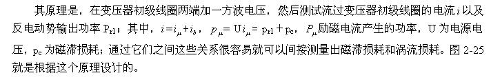 因此,(2-81)、(2-82)、(2-83)、(2-84)式最好只用于對正激式輸出的單激式開關(guān)電源變壓器進行磁滯損耗和渦流損耗功率測試,因為其初級線圈的電感相對比較大,勵磁電流比較??;如果需要對反激式輸出的單激式開關(guān)電源變壓器進行測試,最好只用于對小功率開關(guān)電源進行對比測試。
