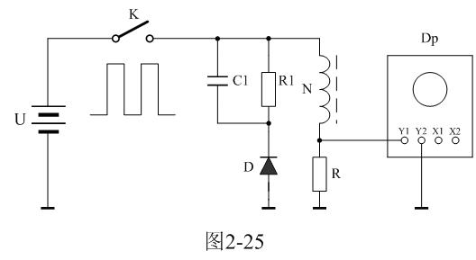 圖2-25中,U是電源電壓,通過控制開關(guān)K不斷地接通和關(guān)斷,就可以把電源電壓調(diào)制成單極性電壓脈沖;N為變壓器初級線圈,D為反激輸出整流二極管;R1為反激輸出負載電阻;C1為濾波電容;R為取樣電阻,通過測量R兩端的電壓,就可以知道流過變壓器初級線圈的電流;取樣電壓被送到示波器Dp進行顯示。