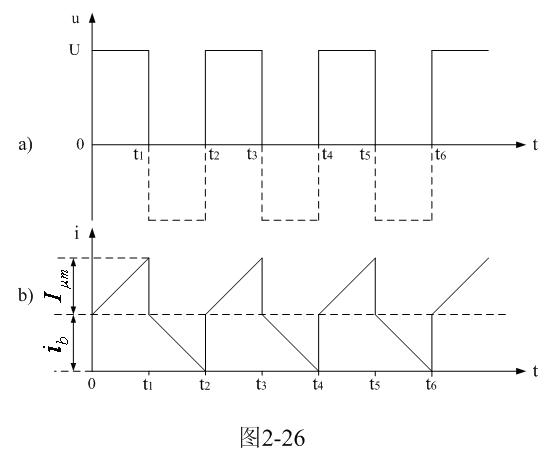 圖2-26是圖2-25電路中變壓器初級線圈兩端電壓以及電流波形圖。圖2-25中,通過改變控制開關(guān)K的占空系數(shù),可使變壓器初級線圈正好工作于電流臨界連續(xù)狀態(tài)或電流斷續(xù)狀態(tài),即:流過變壓器初級線圈中的電流在下一次控制開關(guān)K接通之前為0。