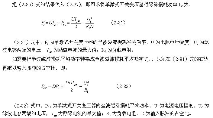 從(2-81)式和(2-82)式還很難看出,單激式開關(guān)電源變壓器的磁滯損耗主要與誰相關(guān),因為等式右邊的減數(shù)和被減數(shù)與輸入電壓、脈沖寬度都有相同變化的趨向。實際上在脈沖寬度固定的情況下,單激式開關(guān)電源變壓器的磁滯損耗是很小的,此結(jié)果在《開關(guān)電源變壓器磁滯損耗分析》的章節(jié)中已經(jīng)分析過。